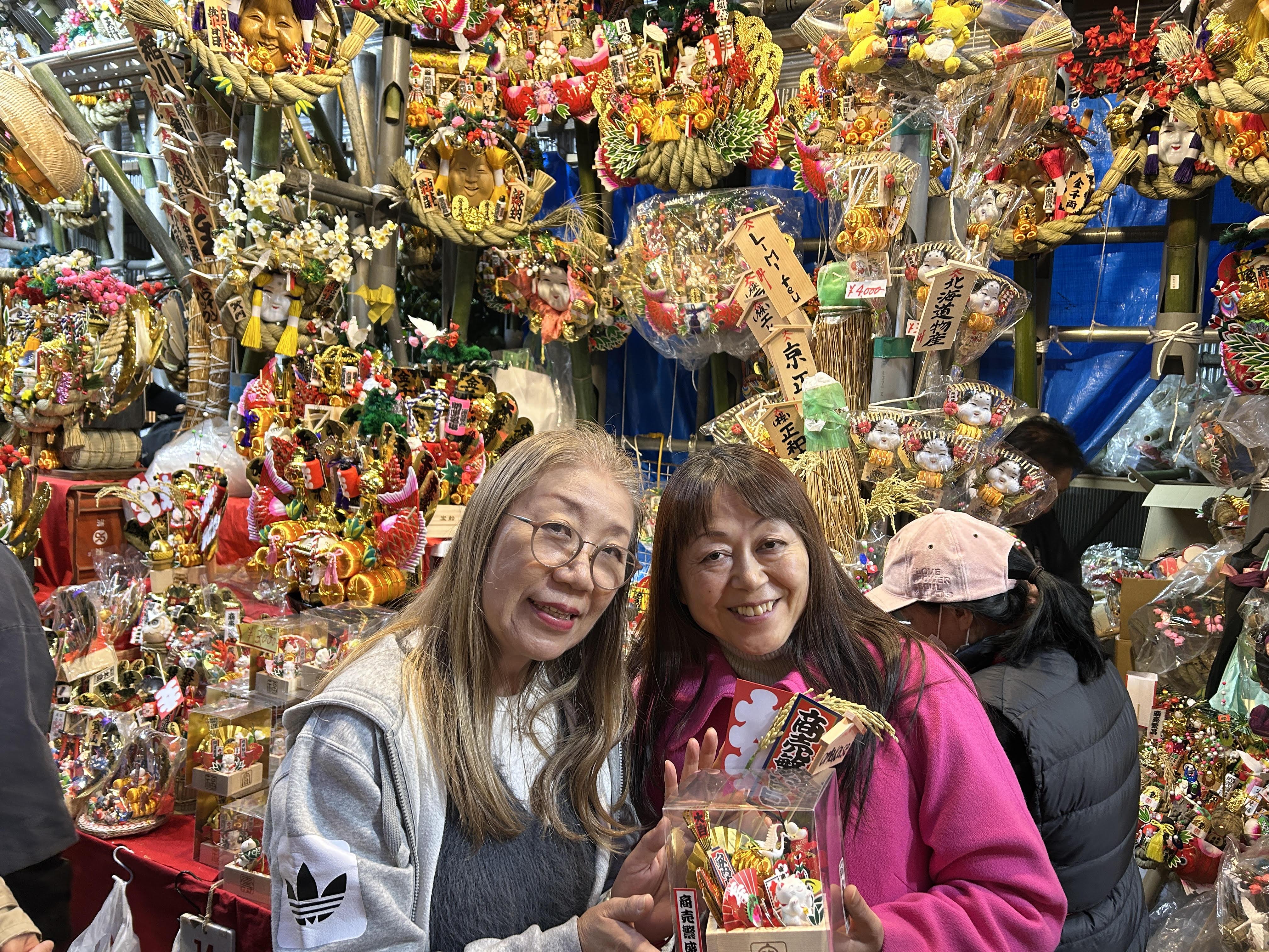Kumade (熊手) literally means “rake” in Japanese. It is a traditional good-luck charm sold at the Tori-no-Ichi Festival (酉の市), which takes place every November at various shrines and temples in Japan, especially those dedicated to the god of good fortune and prosperous business. Originally, the rake was a simple farming tool used to gather fallen leaves. Over time, it came to symbolize “raking in” good fortune, success, and wealth. Today, decorative kumade are elaborately adorned with symbols of prosperity—such as gold coins, cranes, turtles, and masks of deities like Ebisu and Daikokuten. People who run businesses often buy a new kumade each year, choosing one slightly larger than the previous year’s as a sign of continuous growth and increasing luck. After purchasing it, they perform a lively hand-clapping ritual called “tejime” together with the sellers, wishing for good fortune in the coming year. In short, the kumade at the Tori-no-Ichi Festival is not just a decoration—it represents the Japanese spirit of wishing for prosperity, happiness, and success.